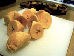 Moving onto the second part of my plantain tutorial, I decided to give the ripened, yellowish-black ones a try based on Jeanise’s preparation (said friend). I’ve never been a fan of them but I now know it’s because I don’t like them served split lengthwise. I much prefer small chunks, cut up and fried crispy golden in some canola oil.