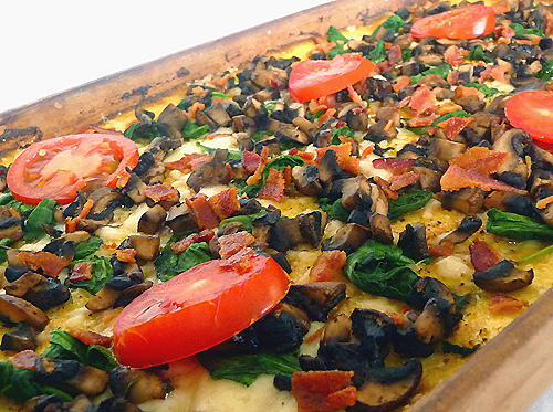 Polenta Pizza with Spinach, Mushrooms, Bacon & Tomatoes
