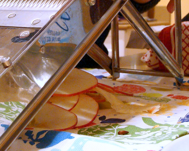 More important than a recipe, though, is you’ll need a very sharp slicer and some silicon baking mats (silpats are my favorite, and please do not try parchment or a greased cookie sheet). Now I was lucky enough to get this fancy chef-type Bron mandoline from the Mr. for Christmas many moons ago. This is certainly worth the investment and will last a lifetime but you can certainly make do with a less expensive gadget. Since it’s the only one I’ve ever used I can’t help with any recommendations, so please chime in on the comments if you have a fave we should all know about. You will need a slicer of some sort though because I don’t know anyone who can slice apples (or potatoes—yes, really!) this evenly paper thin with lightening speed.