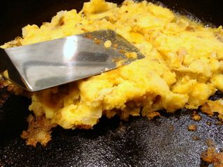 Add mashed potatoes and cumin; stir to mix in onions. Increase heat to medium-high and press potato mixture down with a spatula to form a thin layer in the pan.