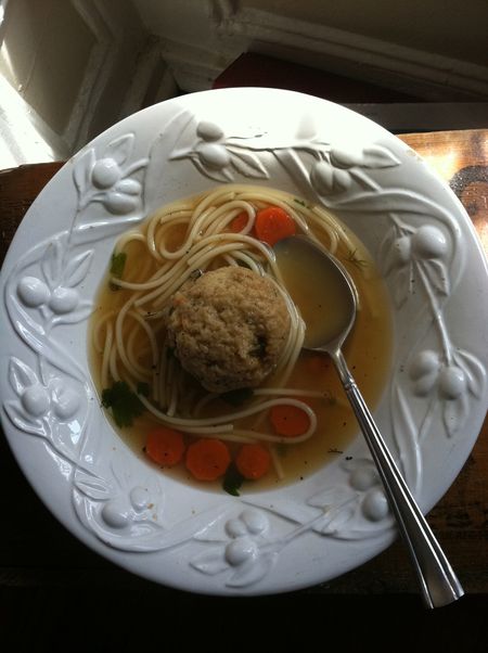 I know, my Jewish friends out there will think this picture is torture. Hours away from the start of Passover, and I’m posting a photo of matzoh ball soup with pasta in it. The picture is from last year. The soup was made for the last Passover we celebrated with Mikey. I didn’t use the pasta in my shiksa seder the night his parents came over, but I did add it to the leftovers. A no-no still for observant Jews, but being a recovering Catholic, I was able to play by my own food rules.