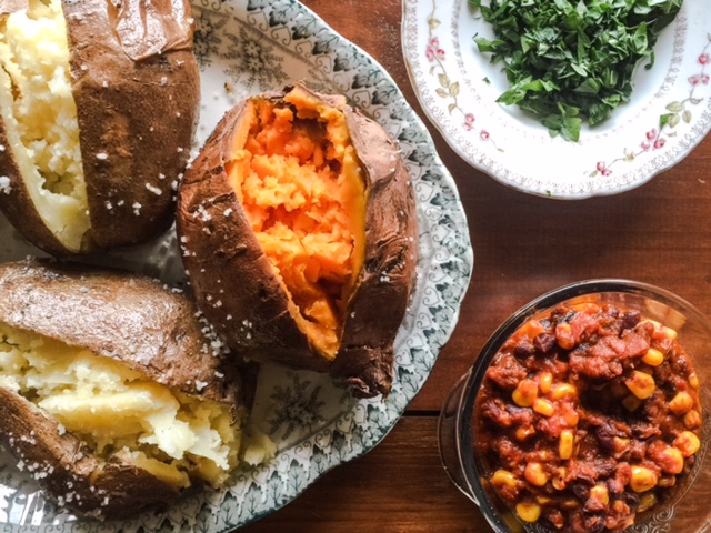 They’re also a great uniter for all the fussy eaters, except of course if you don’t like baked potatoes. Oh yeah, the guilty party doesn’t like baked potatoes, but I don’t let that stop me. See, I figure if I’m putting out a variety of toppings, then she can cobble something to eat from those as I gladly turn a blind eye to the situation (i.e. she fills up on the chili!).