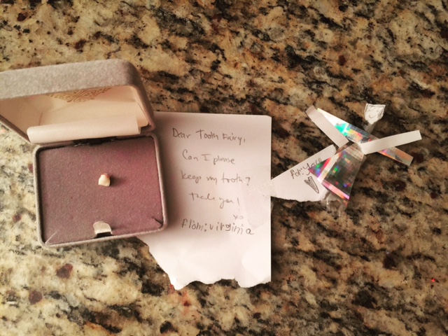 The big event in our house this week my little one losing her top front tooth. This wasn’t her first tooth to go, but something about those bigger ones, front and center, that make me nostalgic for the baby she used to be. Now her smile has this little gap, and once it closes, another tiny chapter of childhood goes into the memory books. She decided to write a note asking the Tooth Fairy if she could please keep her tooth (as she does with all of her baby teeth). What really struck me was that she also made the Tooth Fairy a little gift, a fairy friend crafted from sparkly paper and a toothpick. Virginia said, “the Tooth Fairy gives everyone gifts for their teeth, but I bet no one thinks to leave her a gift in return”.