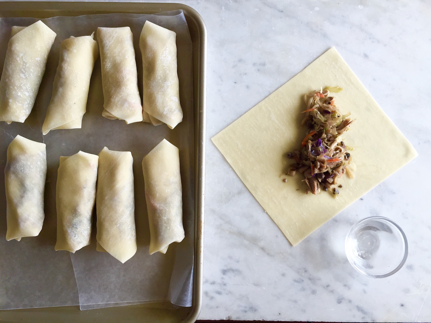 Dab a bit of water over the unfolded edge. Using a gentle pulling motion towards you, roll the wrap closed. Repeat with the remaining wrappers and filling.