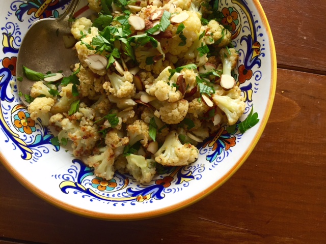 Hot from the oven, cauliflower absorbs flavors —a nice bonus so I can make mine spicy, and keep some mild for my little one. I like to give it a drizzle of olive oil, some korean chili flakes, and even a few gratings of nutmeg, along with a handful of fresh chopped herbs. Sometimes I skip the chili flakes, and use a thick, grainy French mustard and a smidge of honey.
