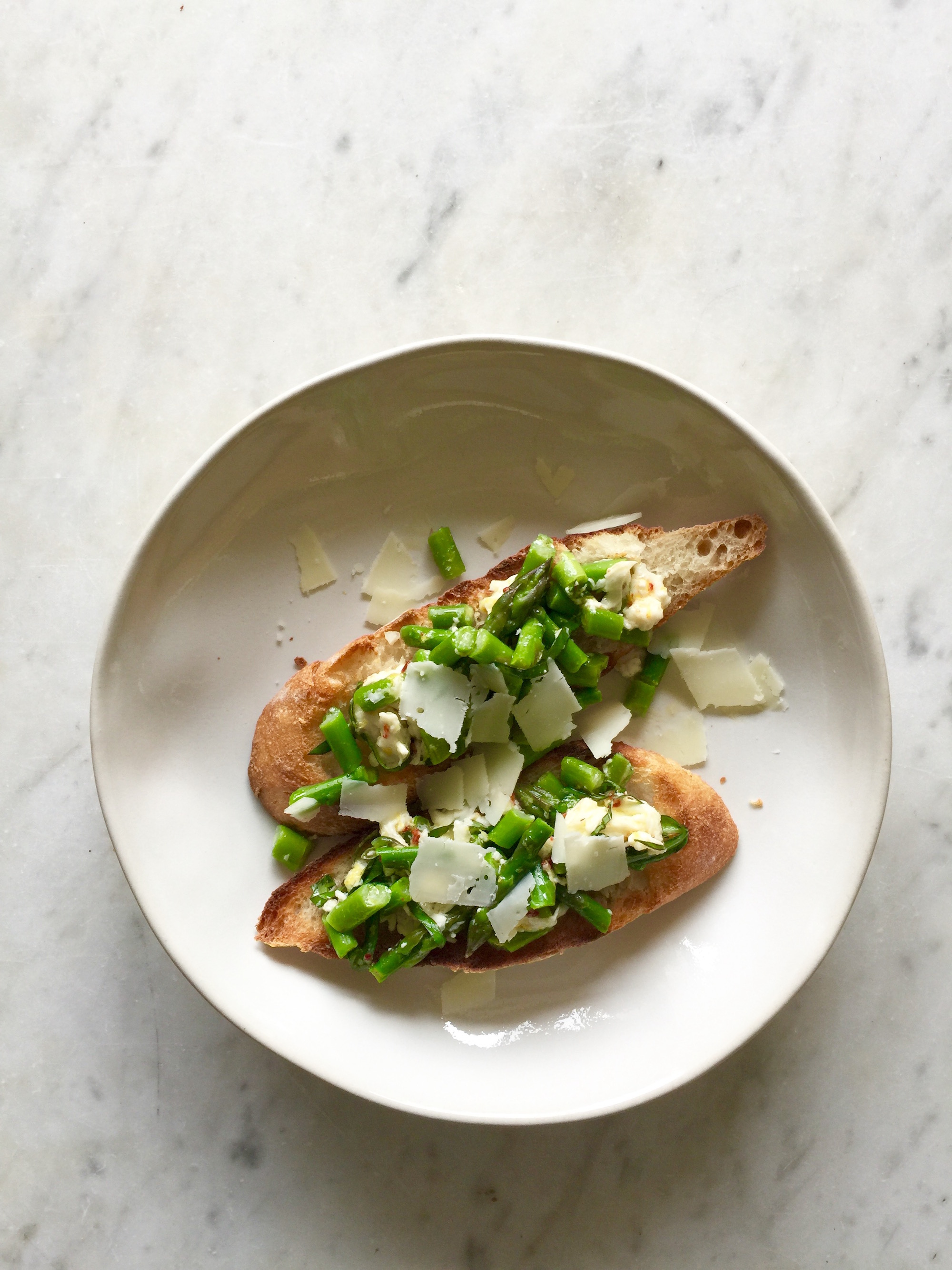Now that we’ve gotten that out of the way, let’s talk about these Asparagus & Pecorino Bruschetta. The stalks had been sitting in a mason jar on my counter for a couple of days. They were the first I’d bought to kick off the season. Come noon on this particular day my tummy started rumbling signaling lunchtime. I needed something fast since there never seem to be enough hours in the work day, but I also wanted to something fresh (i.e. new). I wrinkled my nose, and furrowed my brows, giving a thought to what was already in the pantry.