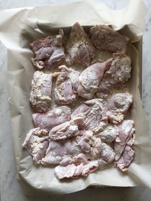 Next, and really this involves no work. Wait. Yes, let your chicken rest with the flour coating for at least 10 minutes.