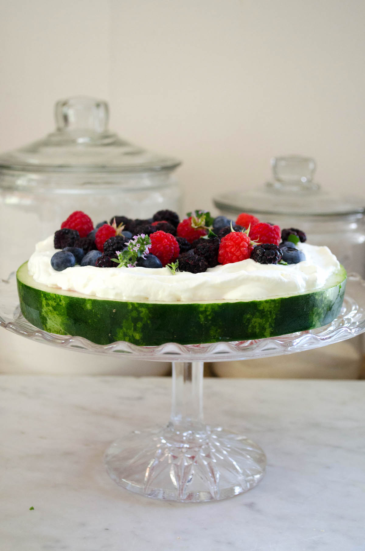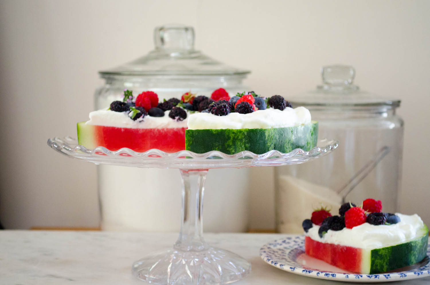A plain ol’ piece of water does nothing for me. One bite into a slice smeared with whipped cream, and topped with fresh berries? Oh. My. Gosh. Within seconds I was a watermelon pizza loving convert. Conversely, the kids took one bite, and wondered why I ruined a perfectly fine piece of fruit, so to each her own.