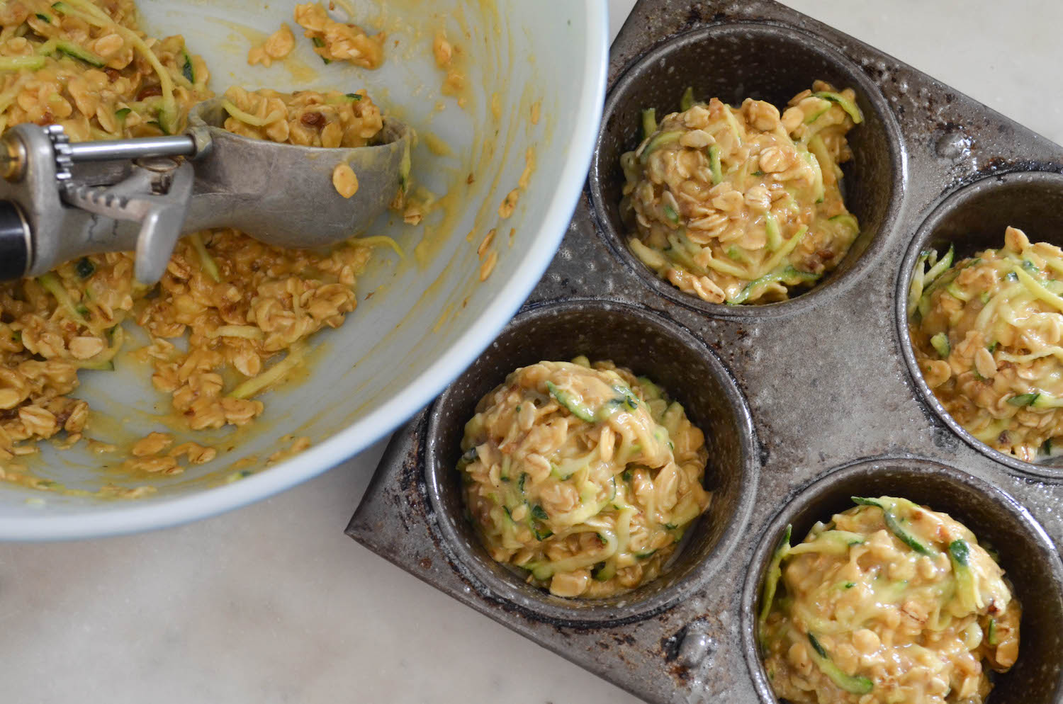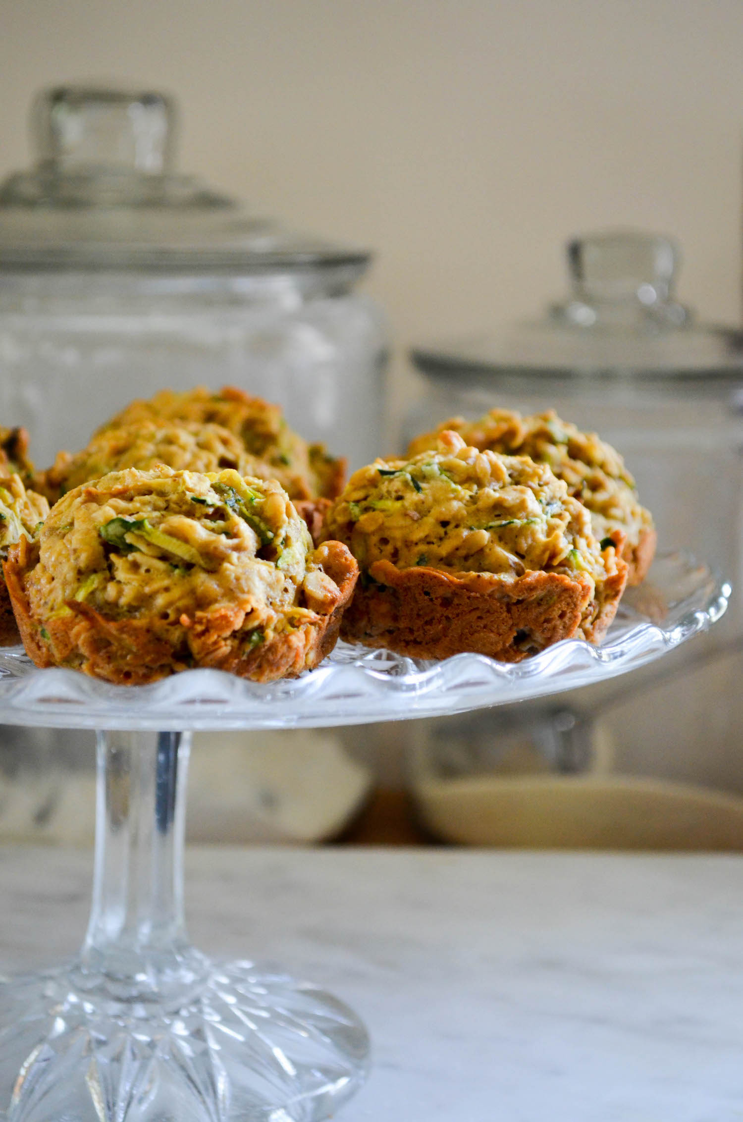 The inspiration came from a recipe I made three years ago for oatcakes from Heidi Swanson’s Super Natural Every Day. Back then I stuck to the original recipe. Much as I loved it, the recipe then went into sleeper mode. It came back to mind while contemplating zucchini muffins recently. I love my recipe for zucchini walnut muffins, and the kids do, too. After so many years of making them, though, it felt like time for a change.