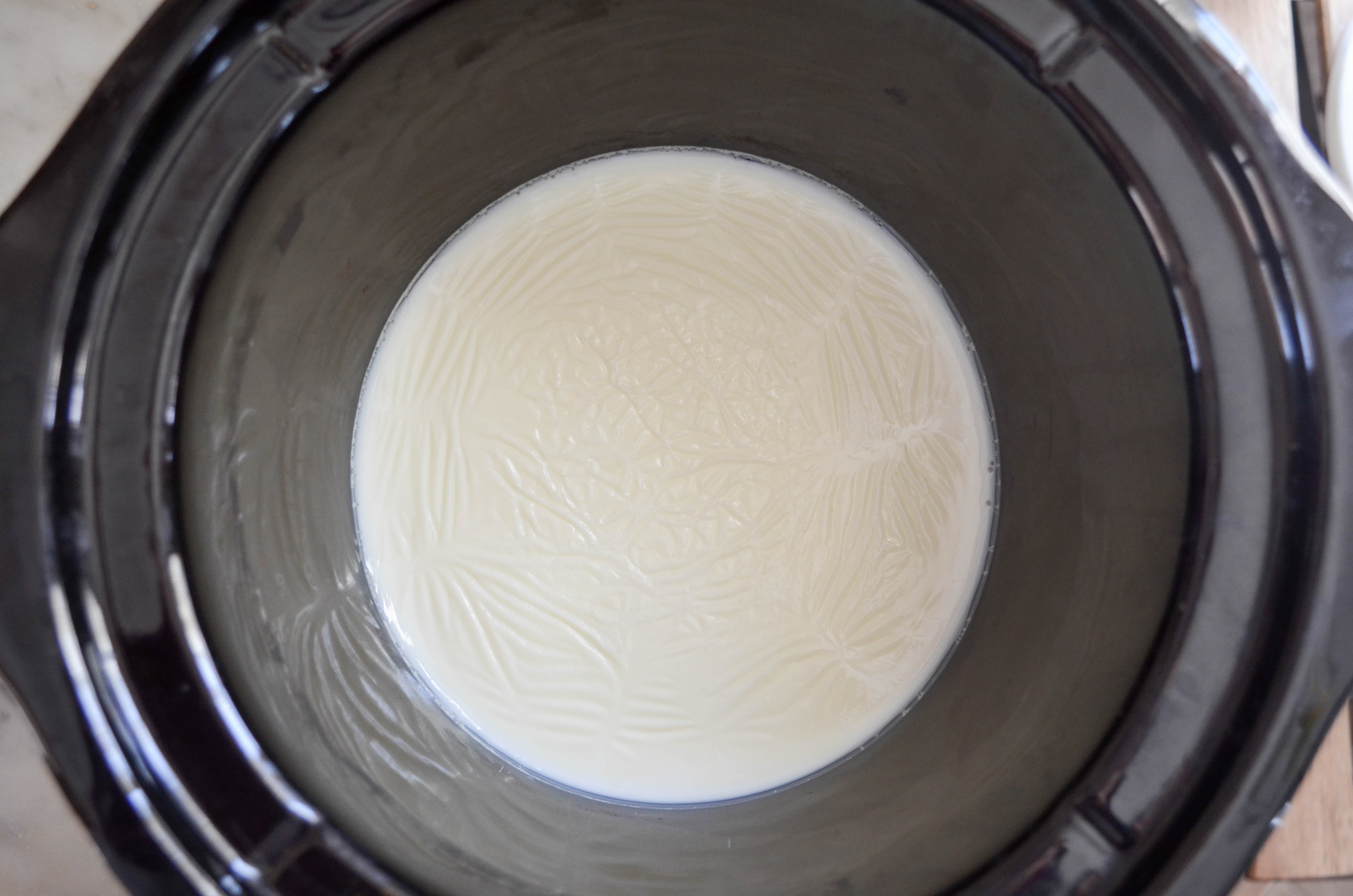 • To make the evaporated milk, add the milk to your slow cooker. Set it to HIGH, and let the milk cook down, 8 to 10 hours, until it reaches the level you made note of with the water.
