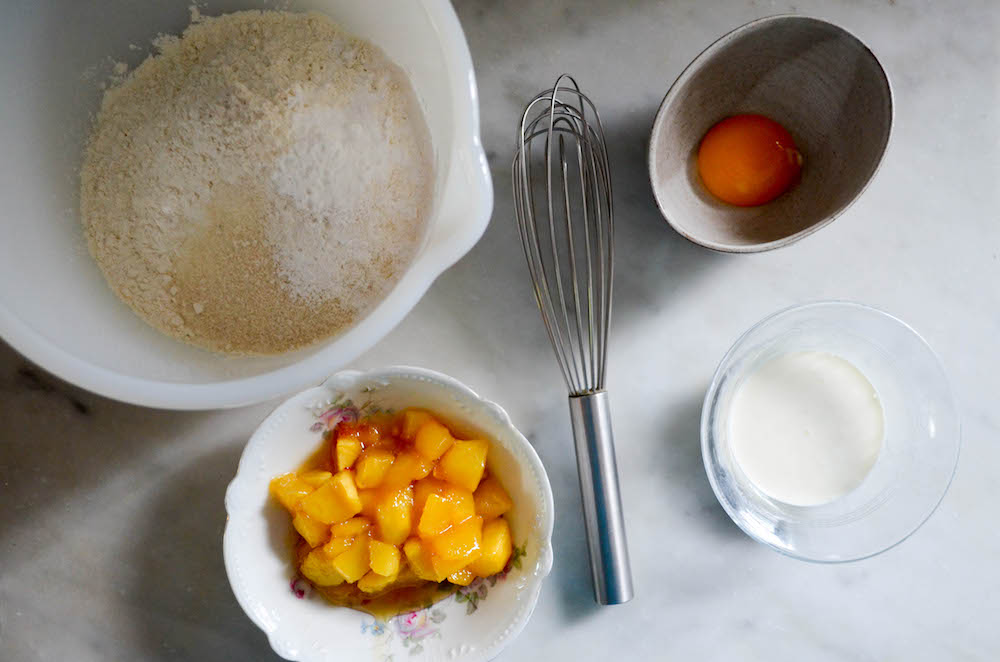 You can add some spices to the peaches while they roast, if you like. Ground cinnamon or ginger would be nice, I imagine. Even some fresh chopped herbs in the flour mixture would be lovely—lemon thyme, mint, basil, or even rosemary.