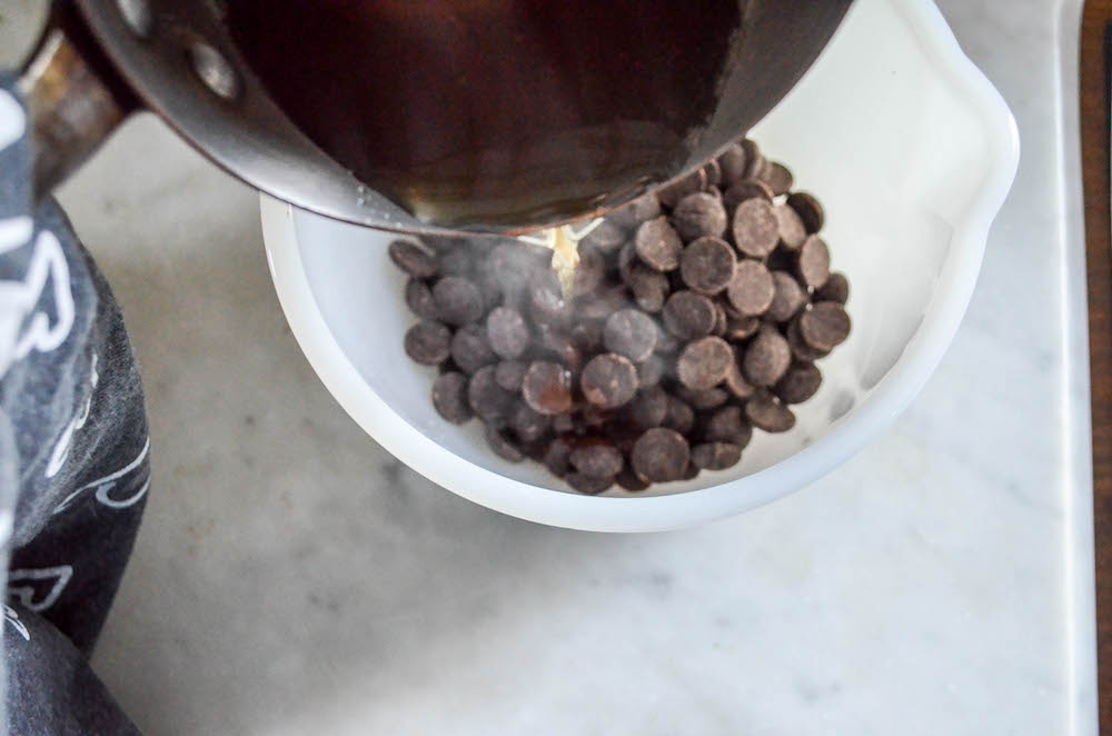 It comes together easily, with just four ingredients. The lack of dairy also means you can keep it out on the counter. You know, just in case you need a reminder to east sundaes more often. It starts by making a simple syrup of water and sugar, which then gets poured over bittersweet chocolate. Use chips or chop up bar chocolate, whichever is easier for you to find.