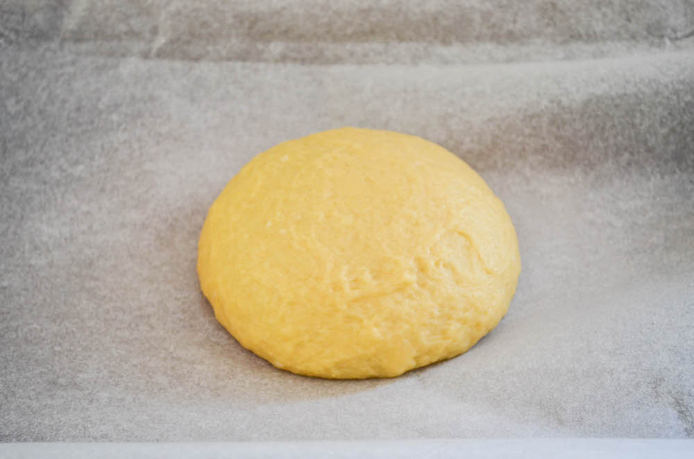 - Place the flour and yeast in a mixing bowl. Pour the milk in a thin stream, while stirring with a wooden spoon. Add ¼ cup plus 2 tablespoons (75grams) of the sugar and the egg yolk