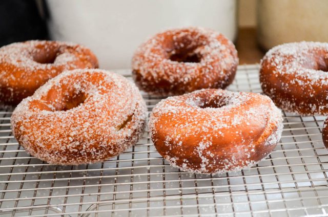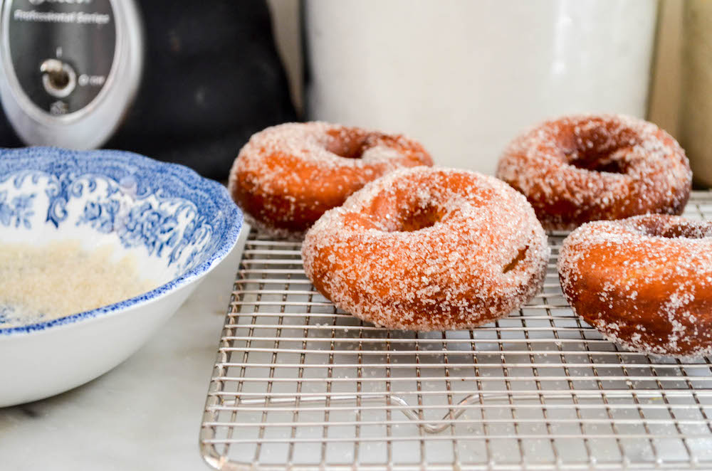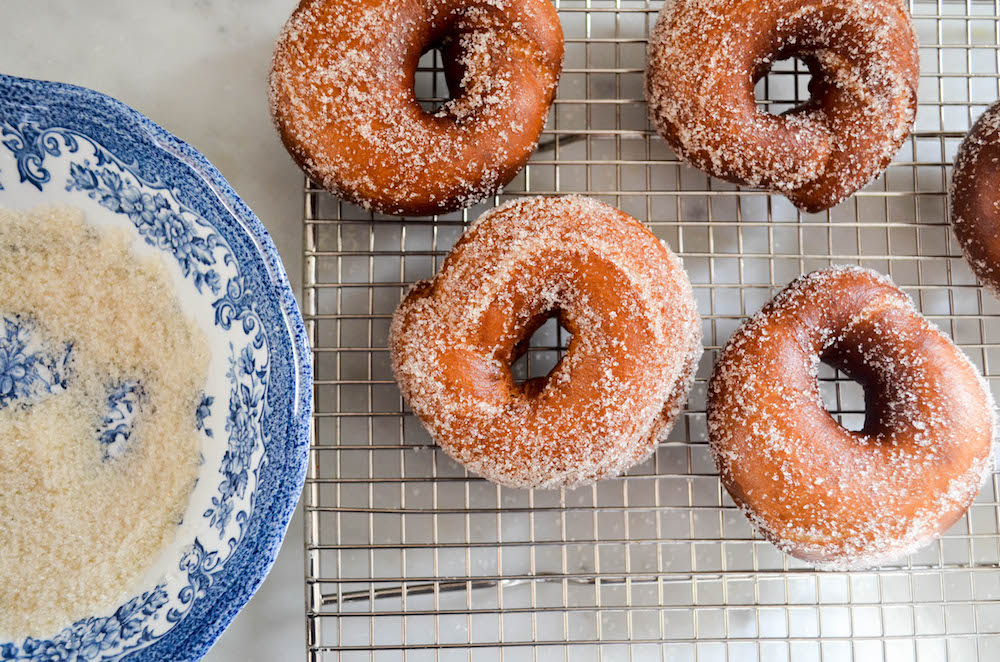 - When ready to fry, add a bit of sugar to a shallow dish. Heat 2-inches of oil in a small pot until it reaches 375ºF. Cook the doughnuts, one at a time, until deep golden brown all over, about 2 minutes per side, turning just once. Drain the doughnuts on a paper towel-lined plate for 20 seconds, then roll in the sugar (if you let them cool too long, the sugar will not stick). Repeat with the remaining doughnuts. Serve hot or at room temperature, but within a few flavors for best flavor.