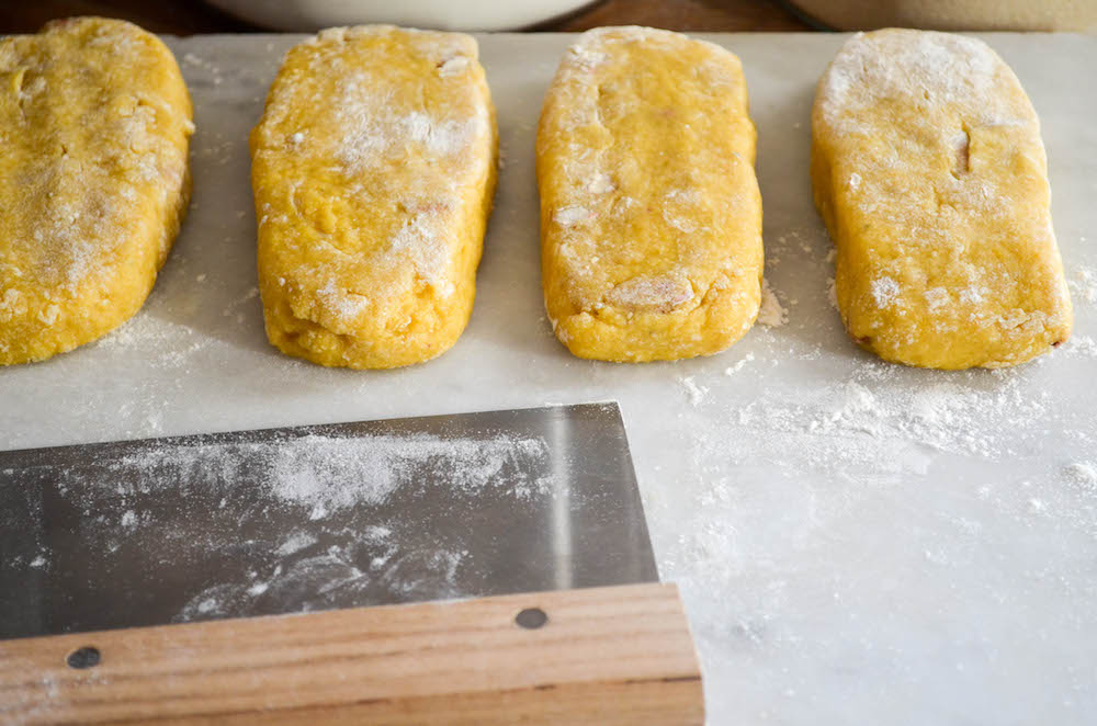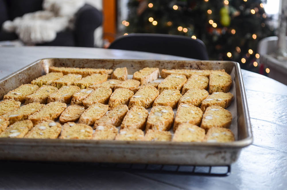 You shape it into thick rectangles, bake them, let them cool slightly, just enough to handle them. The bricks of dough get cut into slices (a serrated knife works best for the job), and baked a second time to crisp up, and dry out the cookies.