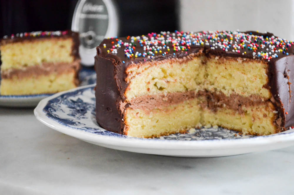 My old school Brooklyn roots shine in this cake— his favorite one, the same cake I made him every year, except for his 50th birthday. It’s a Golden Vanilla Cake (basically this recipe, baked in 6-inch round pans), the best chocolate buttercream frosting in the center and also used as a crumb coat, then finished with a glaze of chocolate ganache. Yes, it’s as perfect as it sounds.