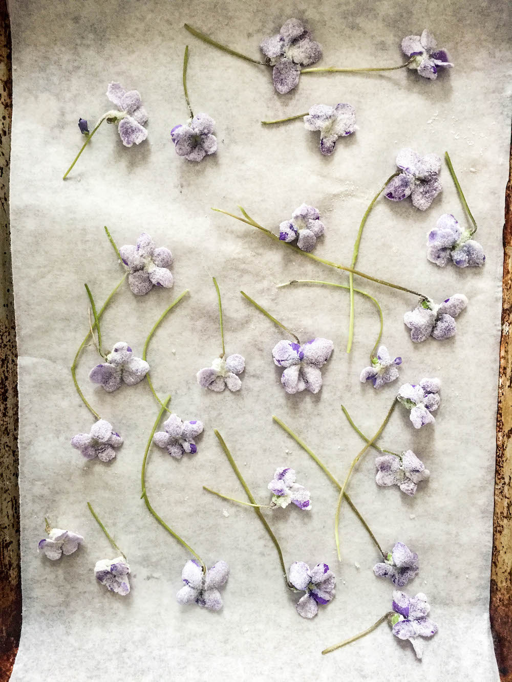 In past years, this has meant violet syrup. The task of gently plucking them from the grass, a tedious endeavor, results in a syrup that captures the taste of spring to infuse into sodas, cocktails, jams, and cakes. Another favorite project, albeit it one that requires a reserve of patience and time, is making candied violets.