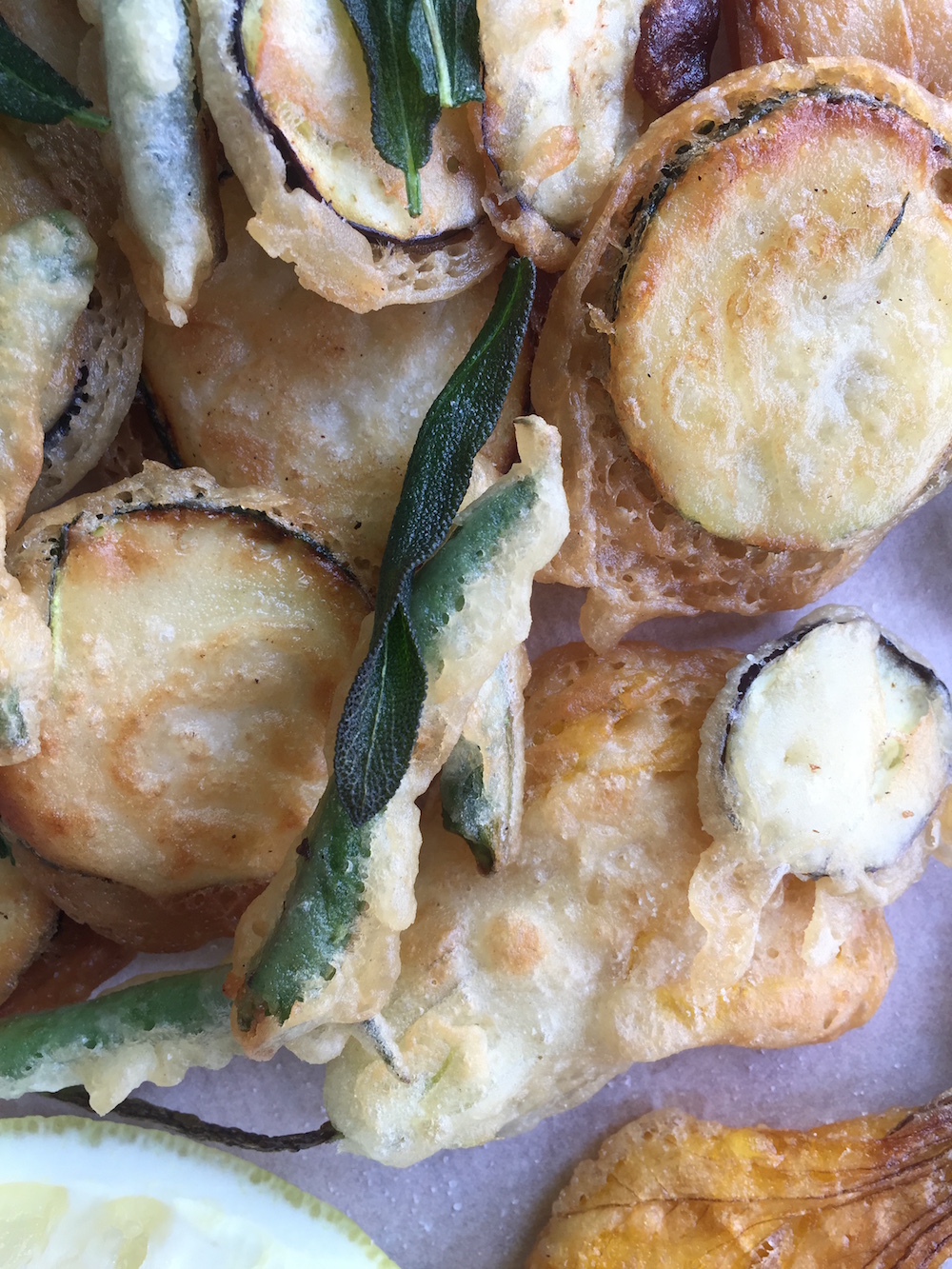 The phrase literally translates to mixed fried. You can use any vegetables you like—best to slice them thin so they cook quickly, otherwise your batter might brown before the vegetable cooks sufficiently. Zucchini, both the whole vegetable and the blossoms, and eggplant are my favorite. Green beans are appreciated for their minimal prep, just snapping off the ends. I love bell peppers, too.