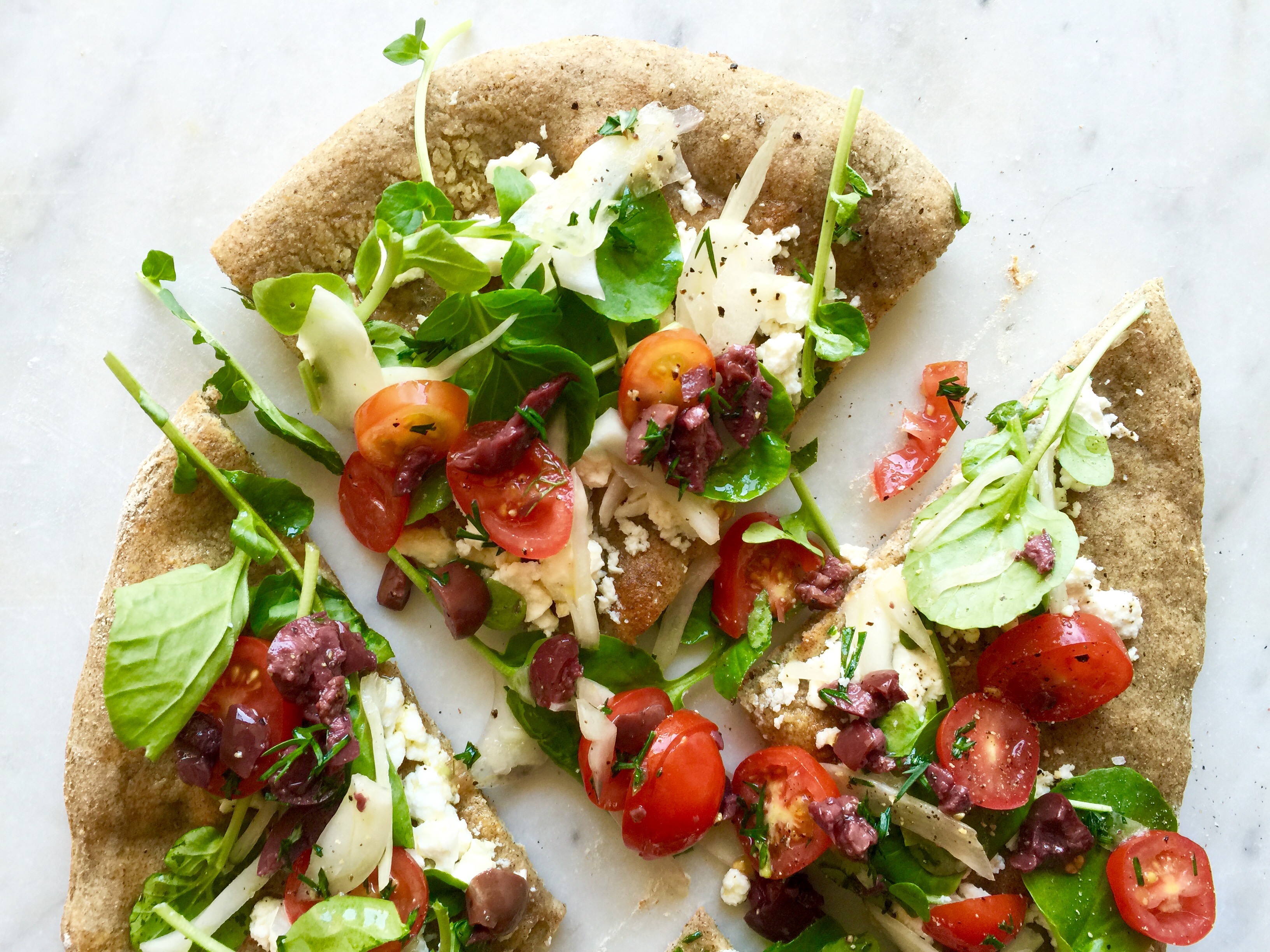 This Mediterranean Pizza is made with a whole grain crust, including spelt and buckwheat flours. As featured in the spring 2016 issue of City Girl, Country Kitchen.